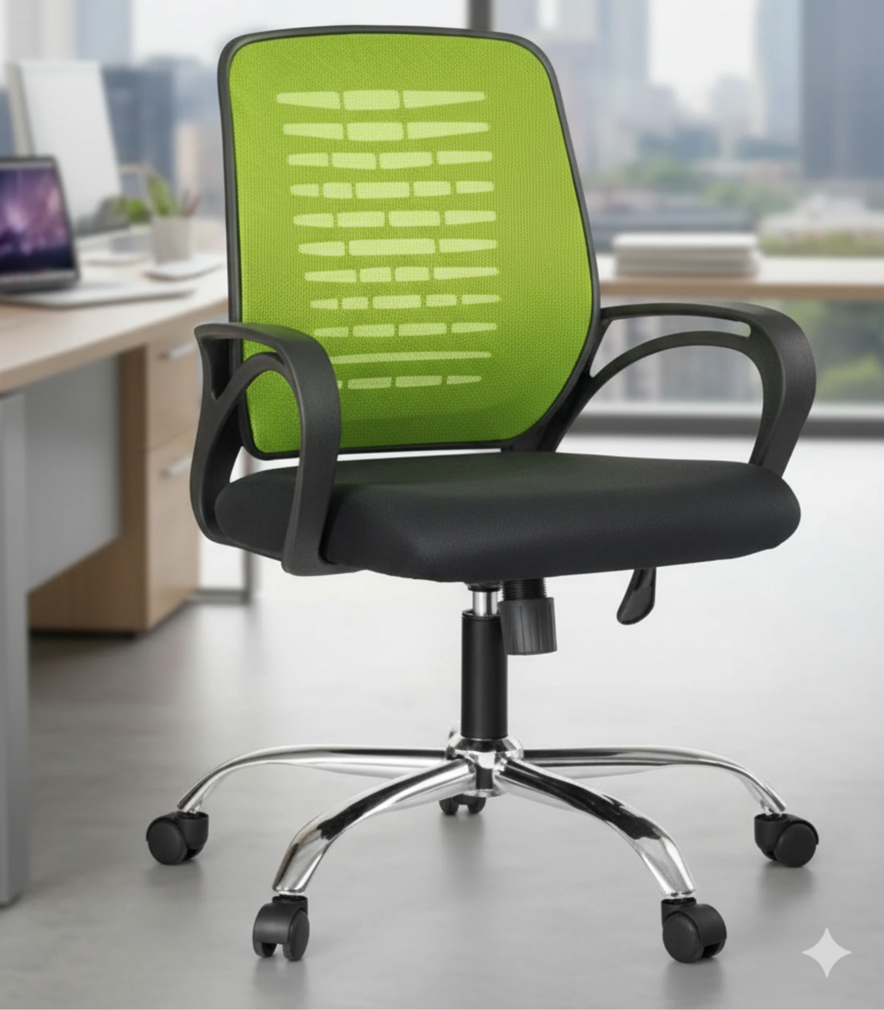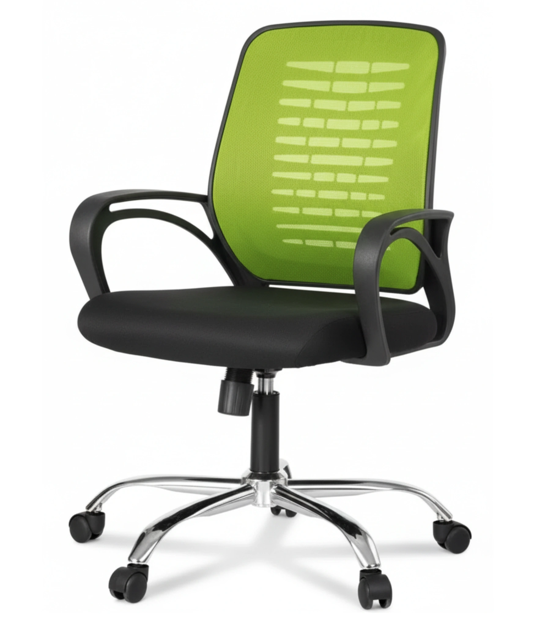 كرسي مكتب شبكي أخضر أنيق بهيكل متين من البلاستيك والمعدن، وآلية صينية سلسة، وتصميم إرغونومي للراحة اليومية.