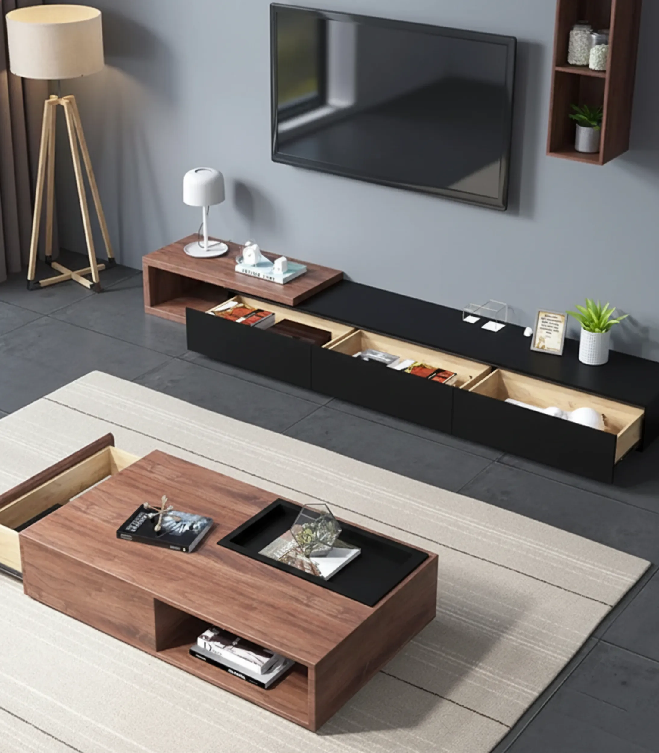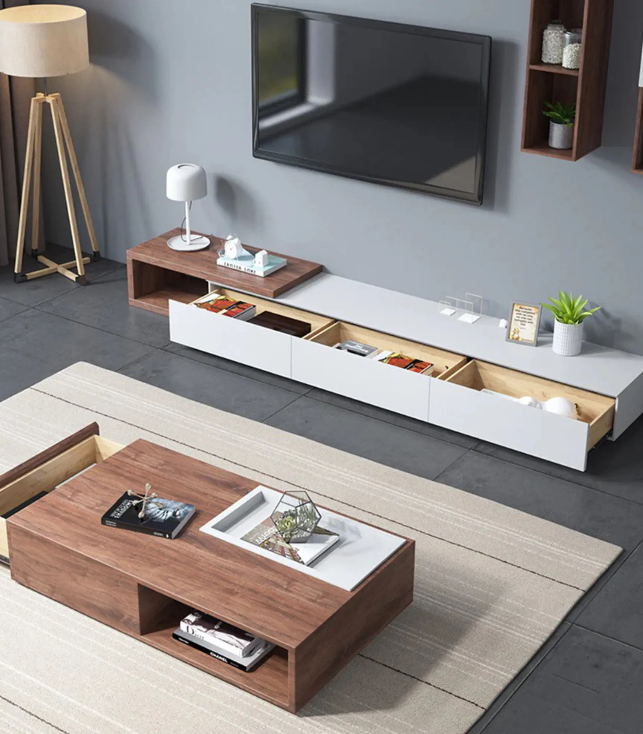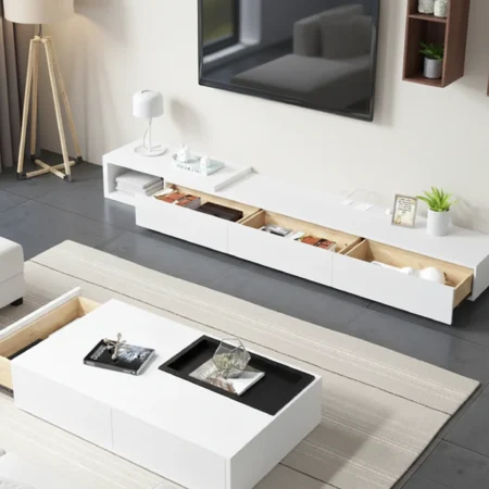 • تخزين طاولة القهوة: درج واحد مدمج بانزلاق سلس للتخزين.