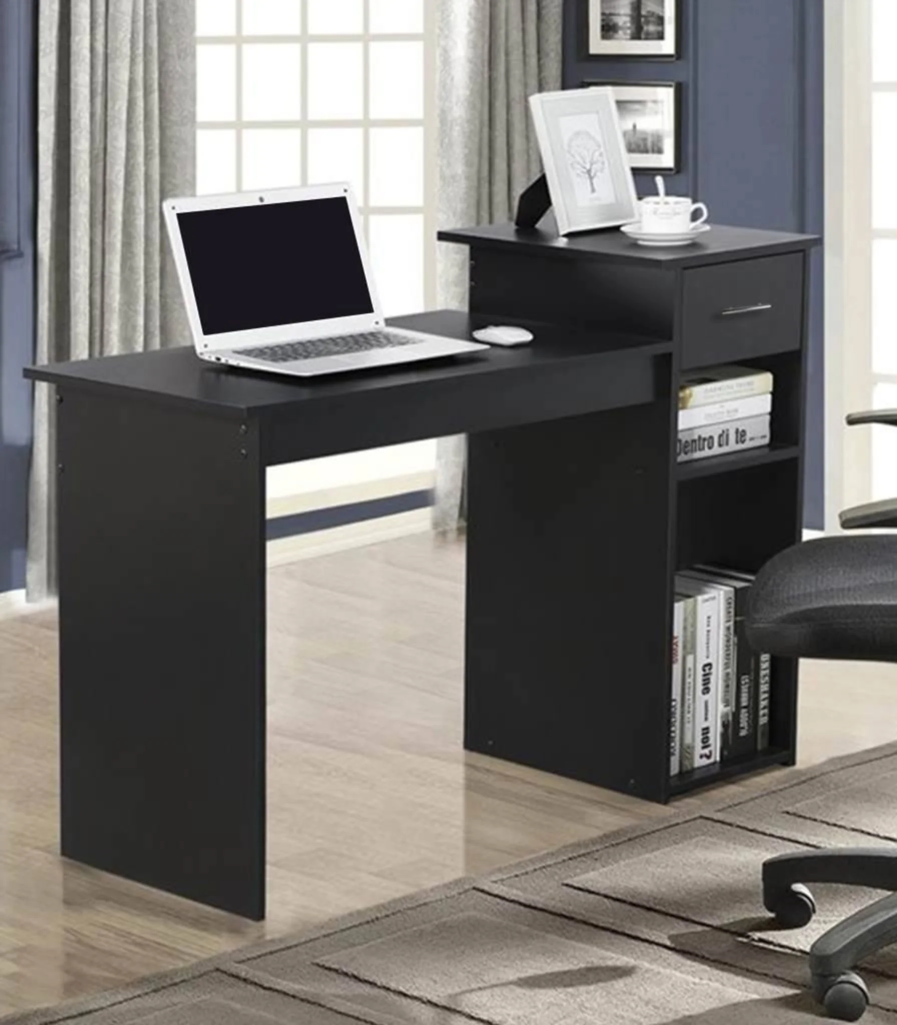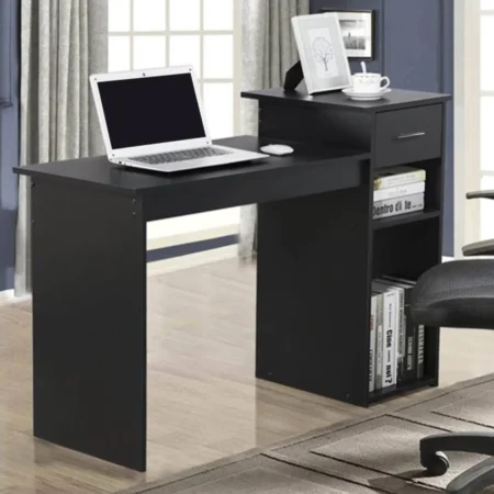 This compact and stylish black office desk is the perfect addition to any modern workspace. With a raised hutch and open shelving, it offers smart storage solutions for your laptop and essentials, making it an ideal study desk or home office furniture.