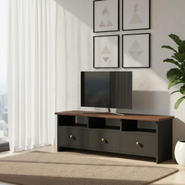 - Three concealed drawers/flaps across the top offer generous, hidden storage for accessories, remotes, and cables, maintaining a perfectly uncluttered look.