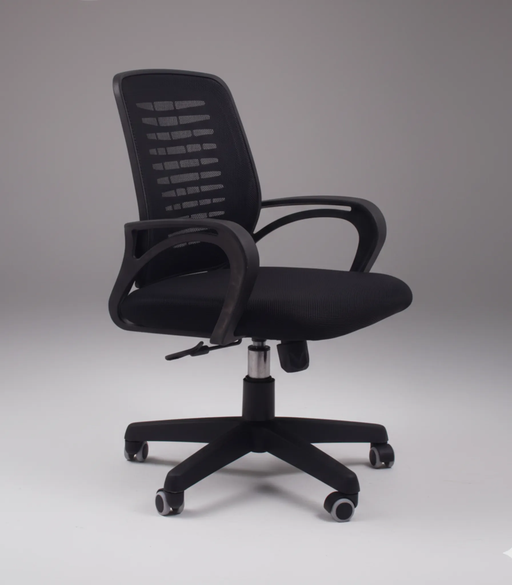Comfortable black mesh office chair with adjustable height, durable metal frame, and smooth Chinese mechanism. Designed for everyday office use with a 1-year warranty.