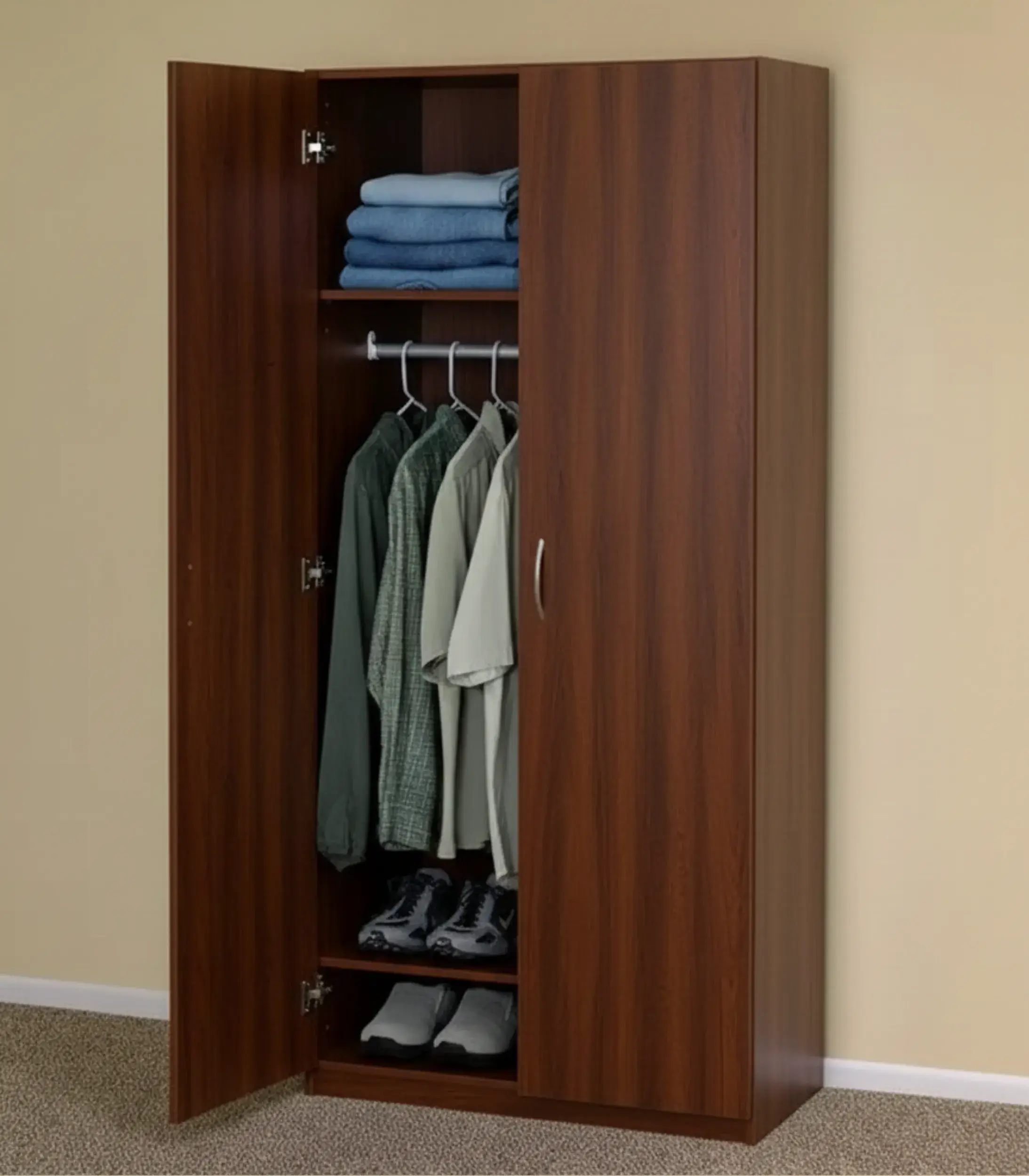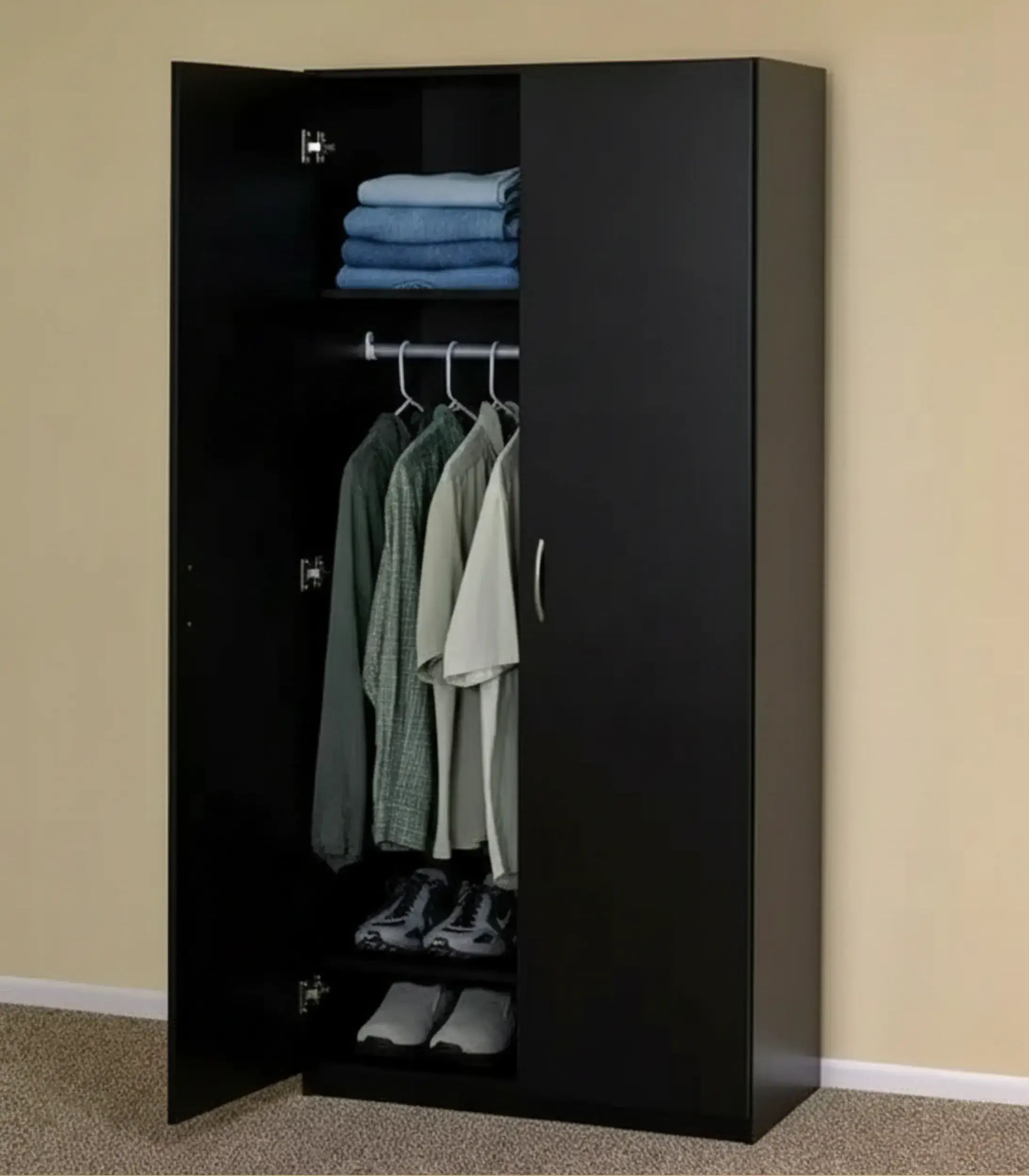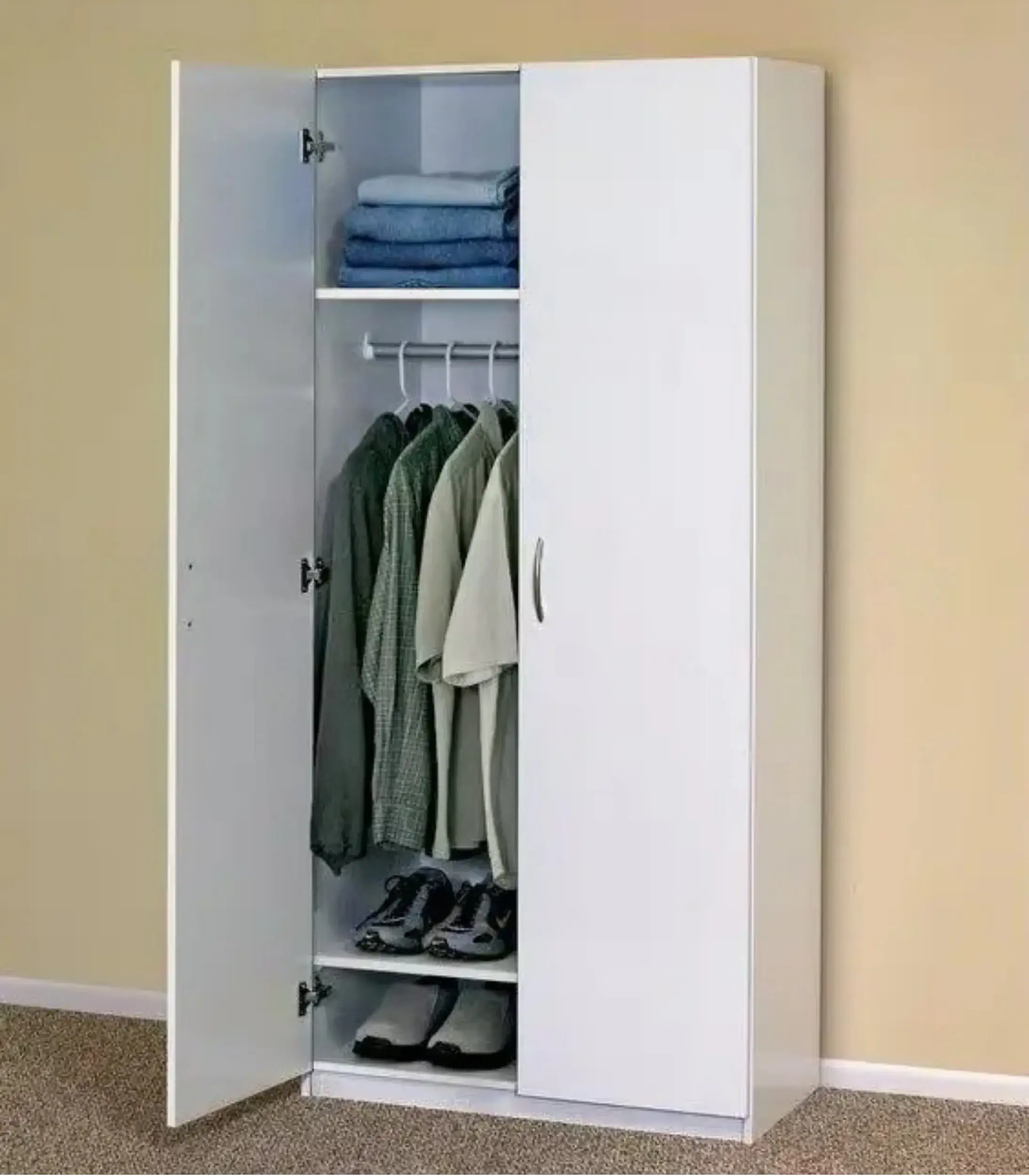 - Internal Layout: 1 Top shelf, 1 Metal hanging rod, and 2 Lower shoe tiers.