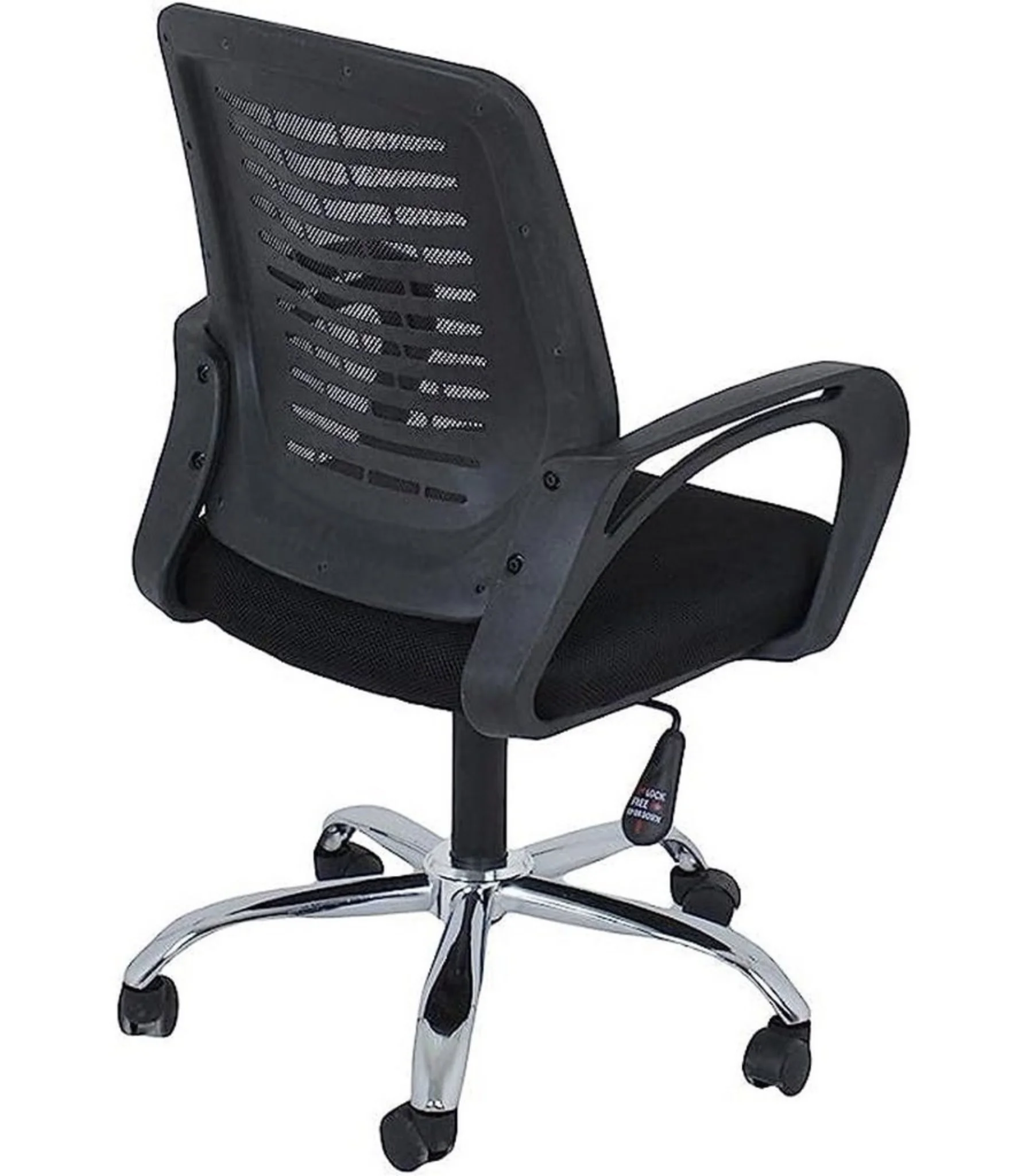 Experience comfort and durability with this modern black office chair, designed to support you through long working hours. Made with a breathable mesh fabric, it provides excellent airflow to keep you cool and comfortable. The sturdy structure combines plastic and metal for long-lasting strength, while the smooth Chinese mechanism ensures effortless height adjustment and flexibility. With its sleek black finish and practical design, this chair is a perfect addition to any office, study, or workspace. Backed by a 1-year warranty, it blends style, comfort, and reliability for everyday use.