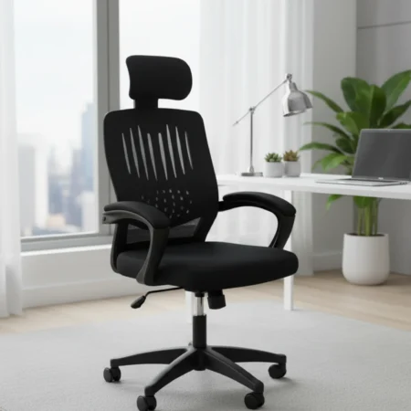 The Plastic and Metal Office Chair – Black High-Back Mesh Comfort is designed for professionals who value both comfort and durability. Built with a strong structure of metal, PVC plastic, and layered wood, this chair offers excellent support for everyday use. The breathable high-quality mesh fabric keeps you cool during long working hours, while the high-density sponge cushioning (30 density) ensures lasting comfort. With ergonomic foam-coated armrests, a supportive high backrest, and a star-shaped PVC movable base, it delivers stability and ease of movement. Equipped with a high-quality Chinese mechanism, this chair allows for smooth adjustments to fit your needs. Its sleek black design makes it a perfect addition to modern offices, study rooms, or home workspaces.