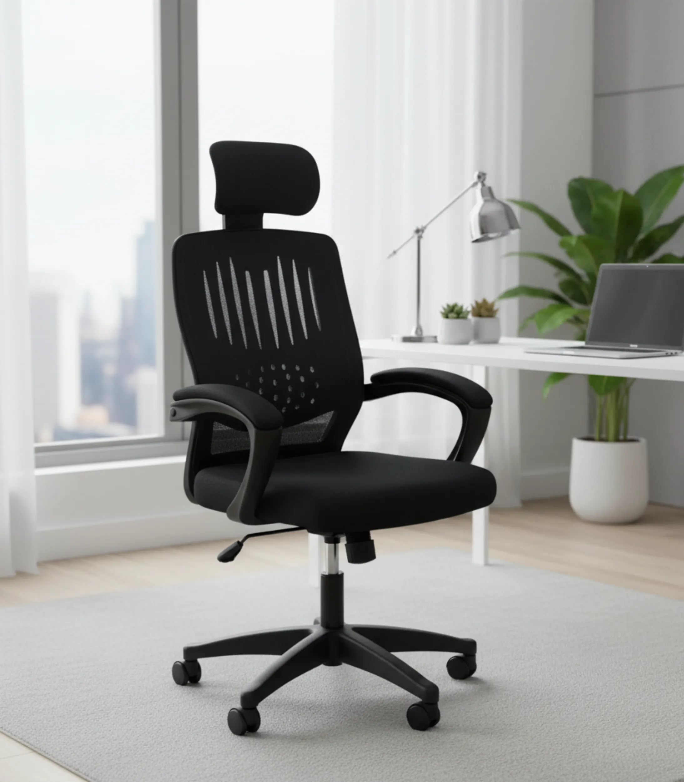 A high-back ergonomic office chair with breathable mesh, high-density sponge cushioning, and a durable PVC star base. Features a smooth Chinese-imported mechanism for adjustable comfort.