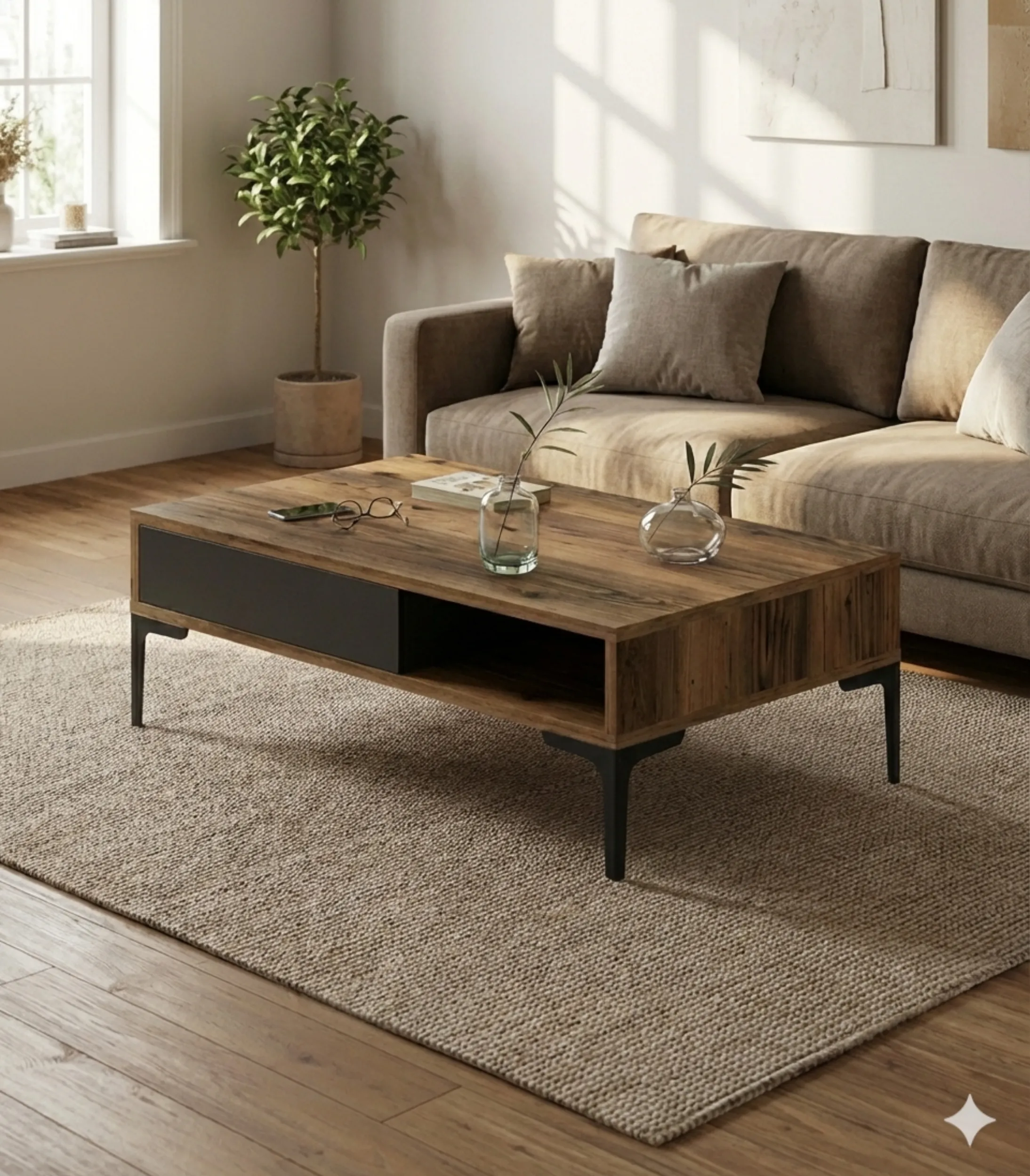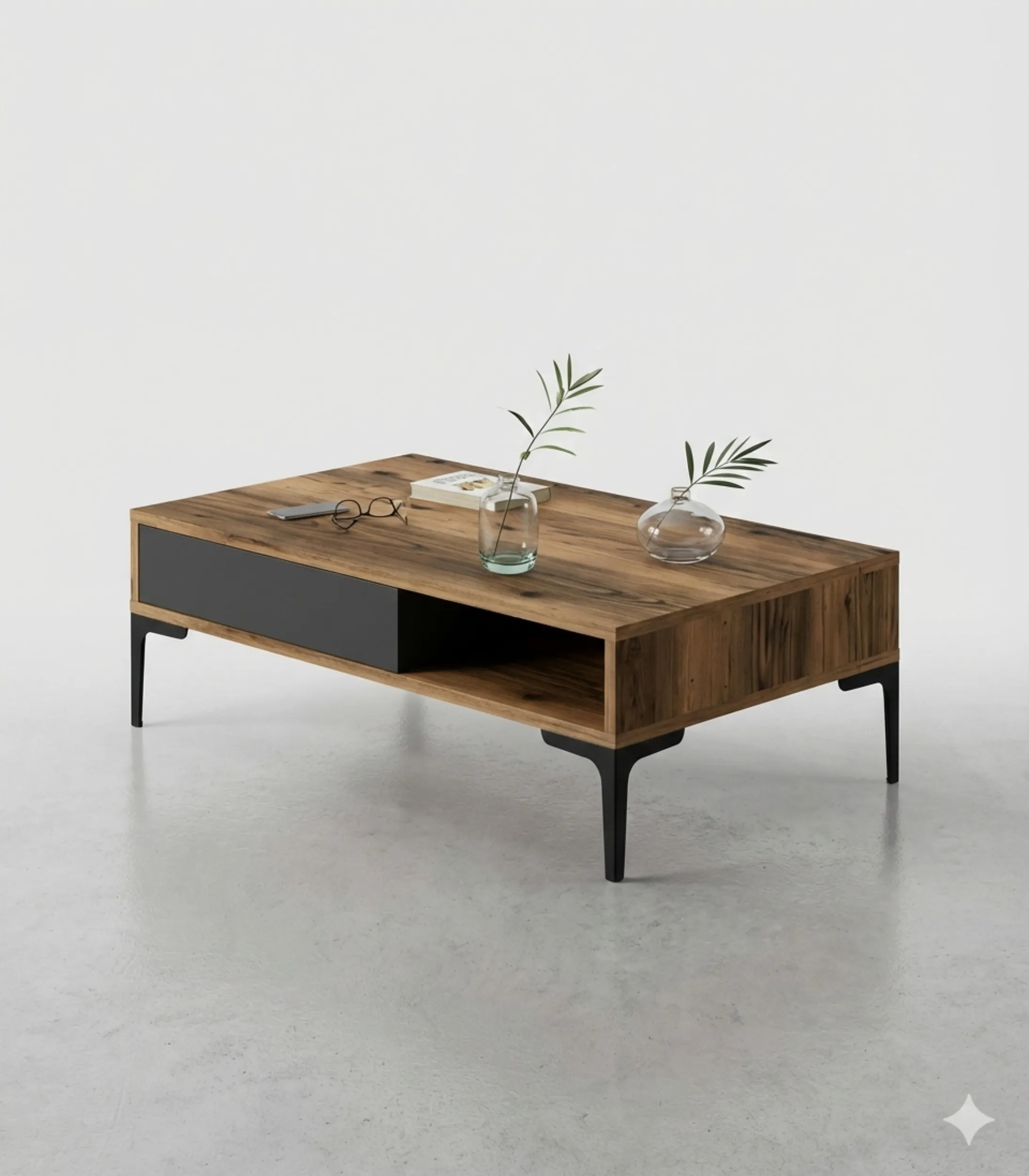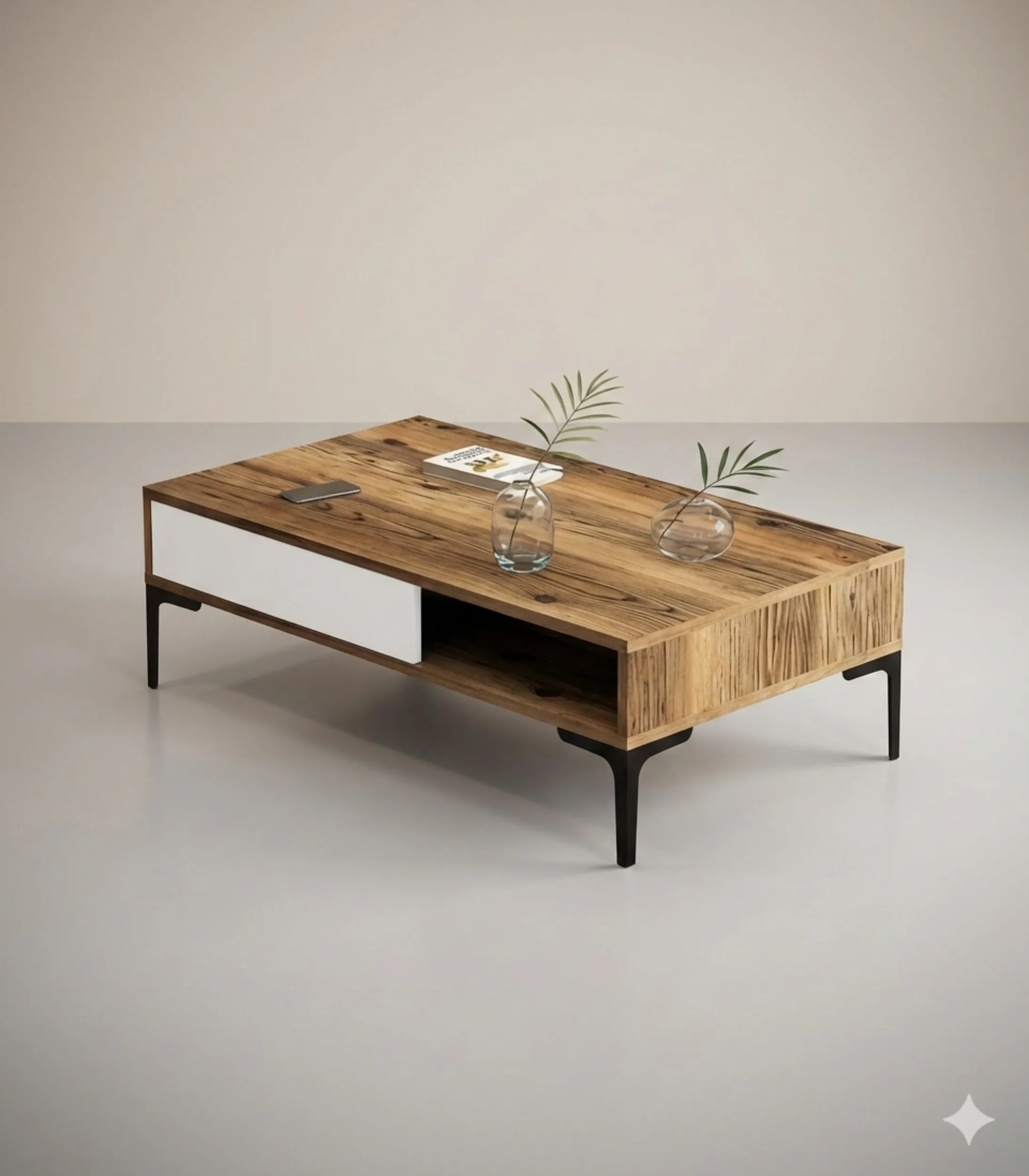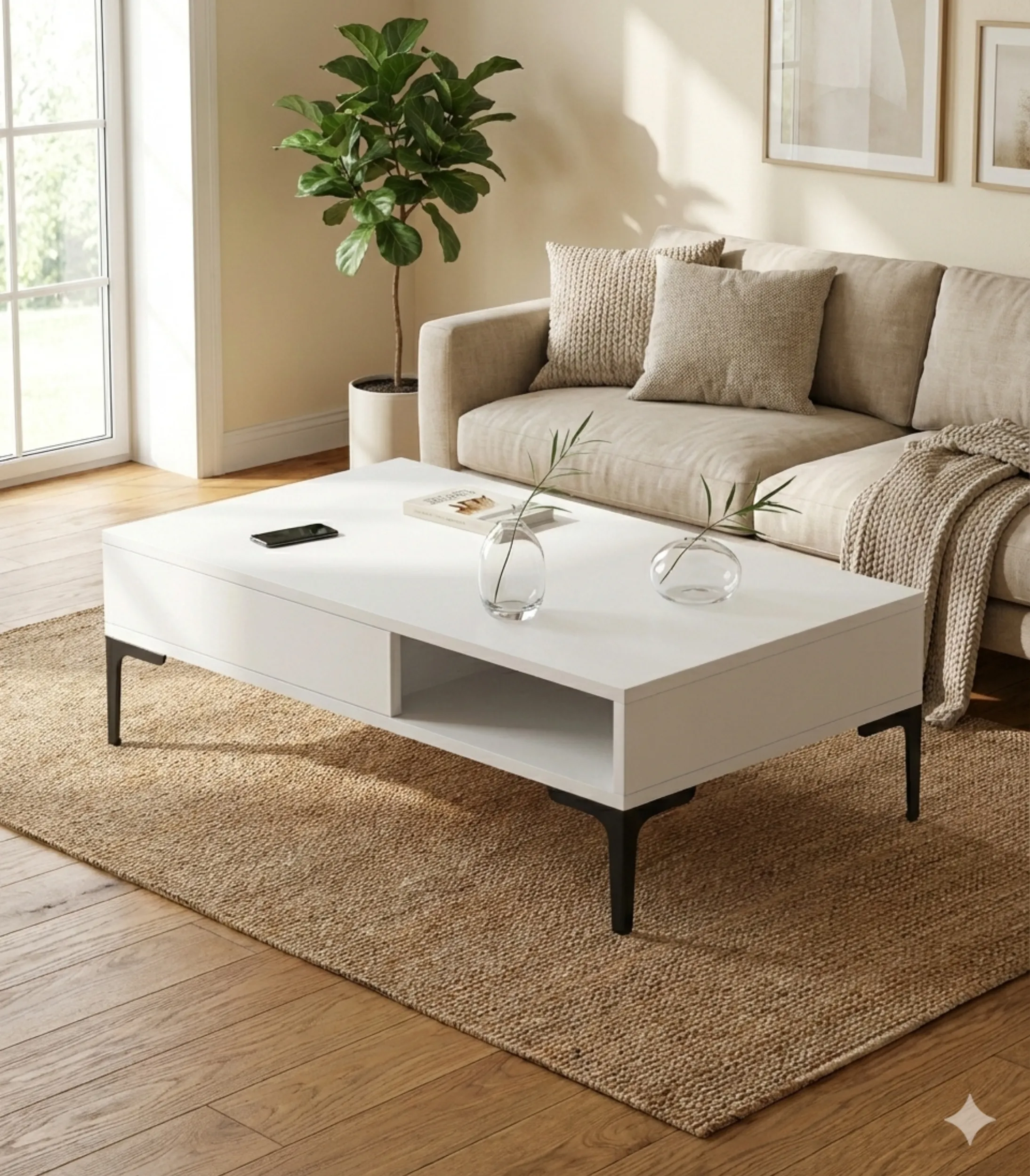 Functionality is built into every line. The center features a smooth-gliding storage drawer to hide away remotes and clutter, flanked by open storage niches that allow for easy access to books or media from either side. Crafted from high-quality MDF, The Grove Table is available in a seamless all-white finish or a natural wood grain with customizable drawer colors: Sleek Black, Pure White, or Matching Wood. Supported by modern, elevated black legs, this table provides a “real-world” storage solution that looks professional and feels timeless.