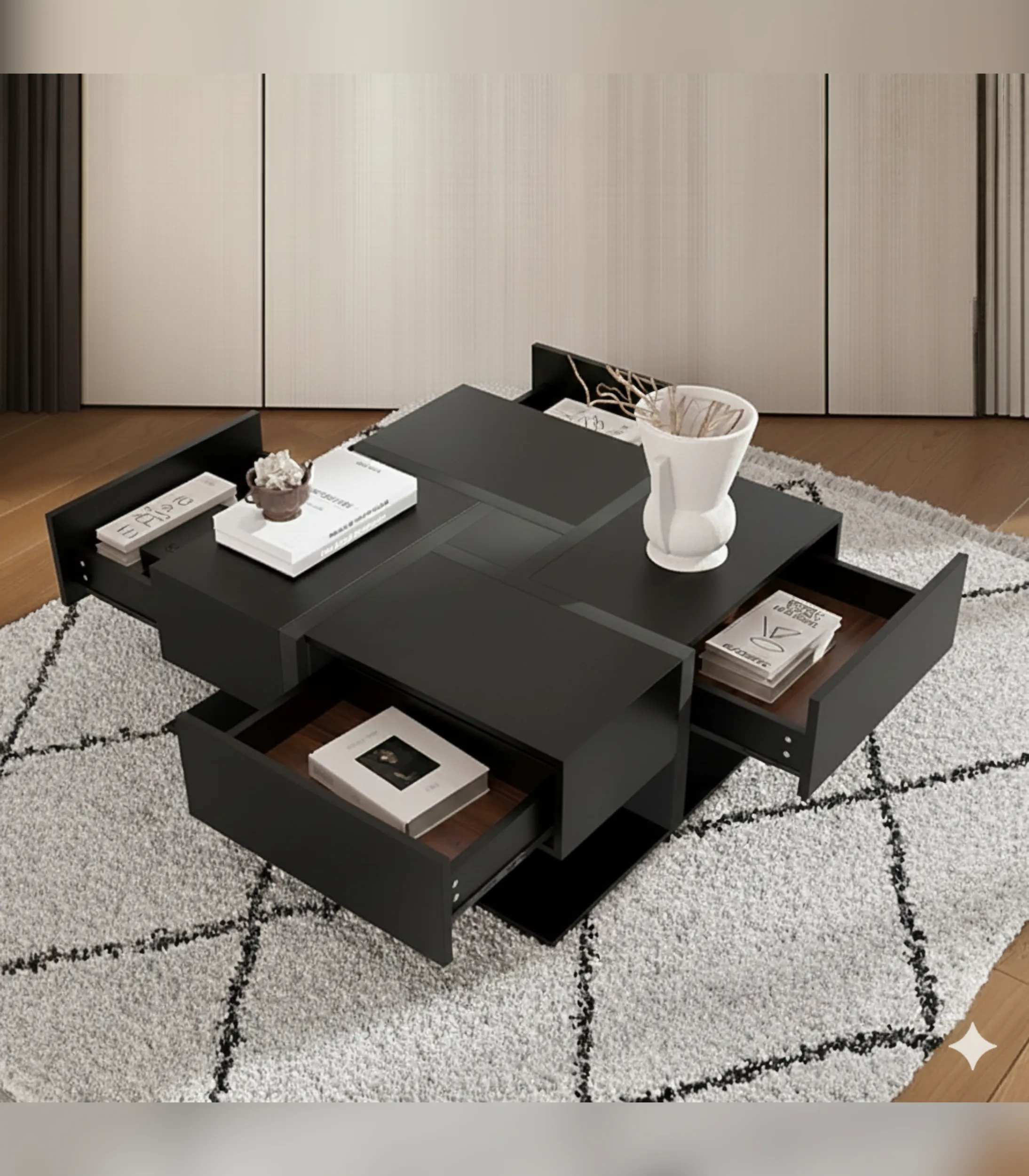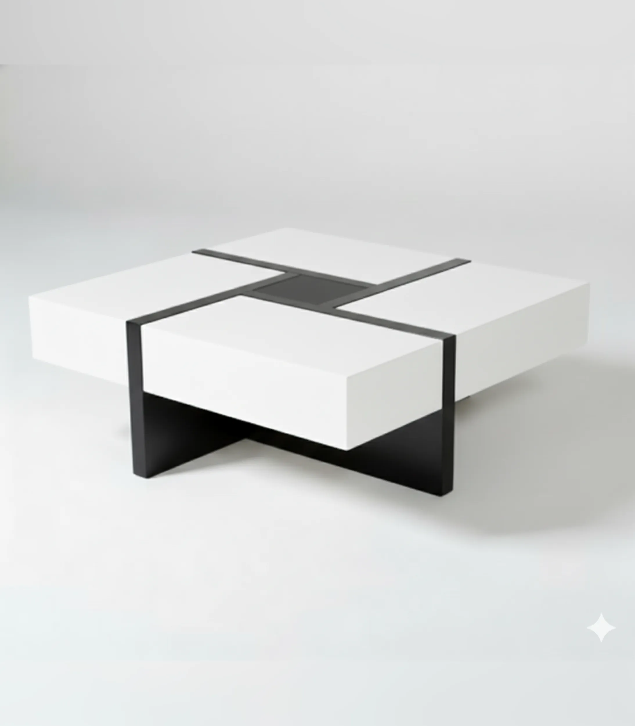 Revitalize your living room with The Quadra Flow Table, a revolutionary piece of home furniture that blends geometric art with ultimate utility. This 90cm square coffee table features a unique four-way drawer system, offering unparalleled storage and a striking modern silhouette in white, black, or brown finishes.