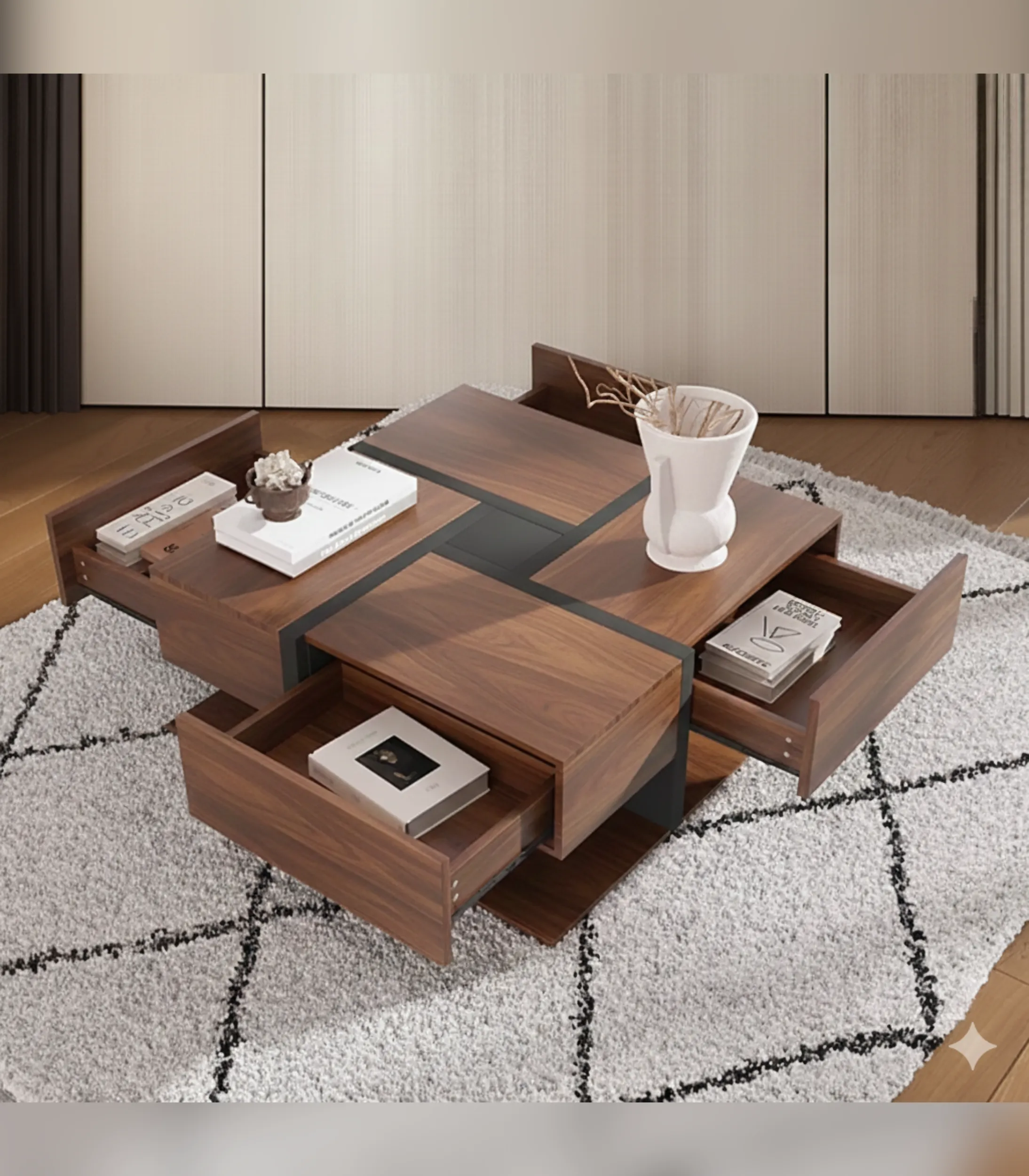 The Quadra Flow Table is designed for those who want their home furniture to be a conversation starter. Moving away from traditional one-sided designs, this table features a dynamic, pinwheel-inspired layout where four independent drawers open from each side of the unit. This innovative 360-degree access ensures that no matter where you are seated, your essentials are always within reach.
